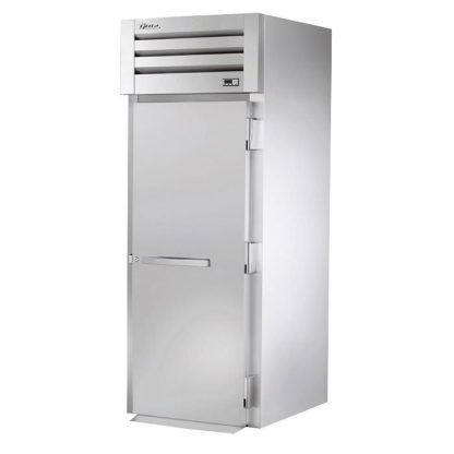 To keep temperatures between 33 and 38 degrees Fahrenheit, this True STG1RRI-1S Spec Series one-section roll-in refrigerator has a self-contained capillary tube system that controls the flow of R134A refrigerant. Its heavy-duty compressor, large condenser, and extra-large evaporator work together to properly preserve food. The evaporator’s self-lubricating fan motors and large fan blades consistently distribute air, while the top-mounted refrigeration system is removed from floor debris and the food zone.