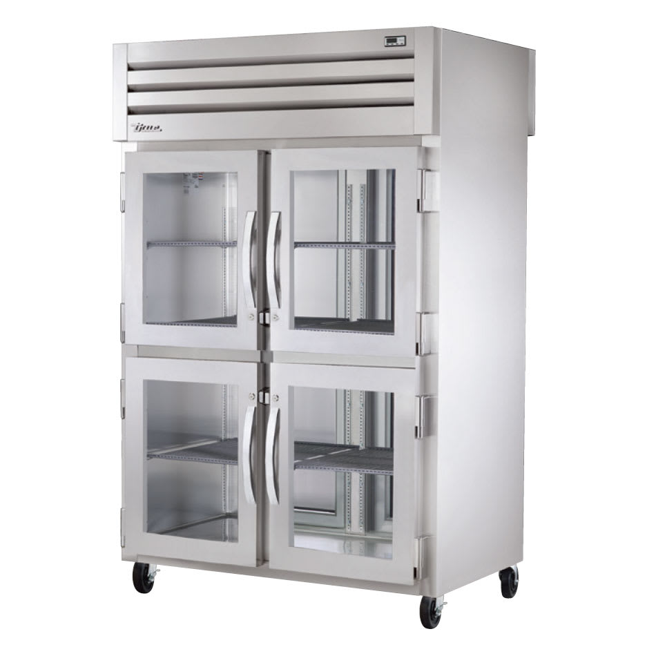 Made of aluminum and stainless steel for simplified cleaning, the True STG2R-4HG-HC two-section reach-in refrigerator is heavy duty and corrosion resistant. Foamed-in-place polyurethane insulation increases the cabinet’s structural stability and holds cold air inside. Product in the cabinet sits on six corrosion-resistant, coated shelves and is visible under bright LED lighting.