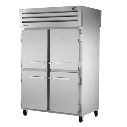 Constructed with front and rear doors, the True STG2RPT-4HS-2S-HC two-section pass-thru refrigerator can be placed between the front of the house and back of the house. It has solid doors on each side, with half doors on the front and full doors on the rear that are made of stainless steel and self-close to retain cold air. Past 120 degrees, the doors stay open so users can stock product.