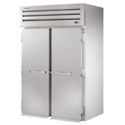 Stainless steel ramps on the True STG2RRI89-2S two-section roll-in refrigerator enable users to roll racks into the cabinet, which can hold two 27-inch-wide by 29-inch-deep by 72-inch-tall racks and has interior bumpers to protect the wall from knocks. Incandescent cabinet lighting provides visibility, so operators can see the stored items, and the solid doors are made of stainless steel. Their self-closing design retains cold air, while the stay-open feature keeps them open past 120 degrees.
