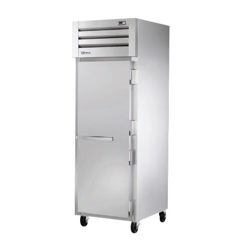 An external temperature display on this True STR1F-1S-HC single-section reach-in freezer shows the operating temperature, which can be read in Fahrenheit or Celsius. The unit uses R290 hydrocarbon refrigerant—a more eco-friendly option than traditional refrigerants. Because it is positioned away from the kitchen floor, the top-mounted refrigeration system will not suck in as much dirt and debris as bottom-mounted units. Frost in the freezer is removed by automatic defrost cycles that begin based on a timer and finish when the temperature is back to a safe level.
