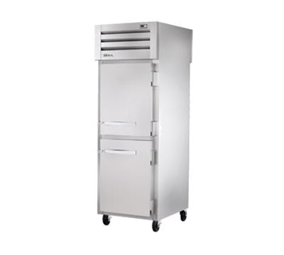 Half doors on the front and back of the True STR1FPT-2HS-2HS Spec Series® single-section freezer create a pass-thru design for access from either side, connecting the front of the house with the back of the house. Each solid door is made of stainless steel, self-closing before 120 degrees and staying open past. These doors have locks to secure stored items. For product organization, the unit includes three adjustable chrome shelves, while the interior is illuminated by LED lighting. This freezer is made of stainless steel to resist corrosion, provide strength, and simplify cleaning.