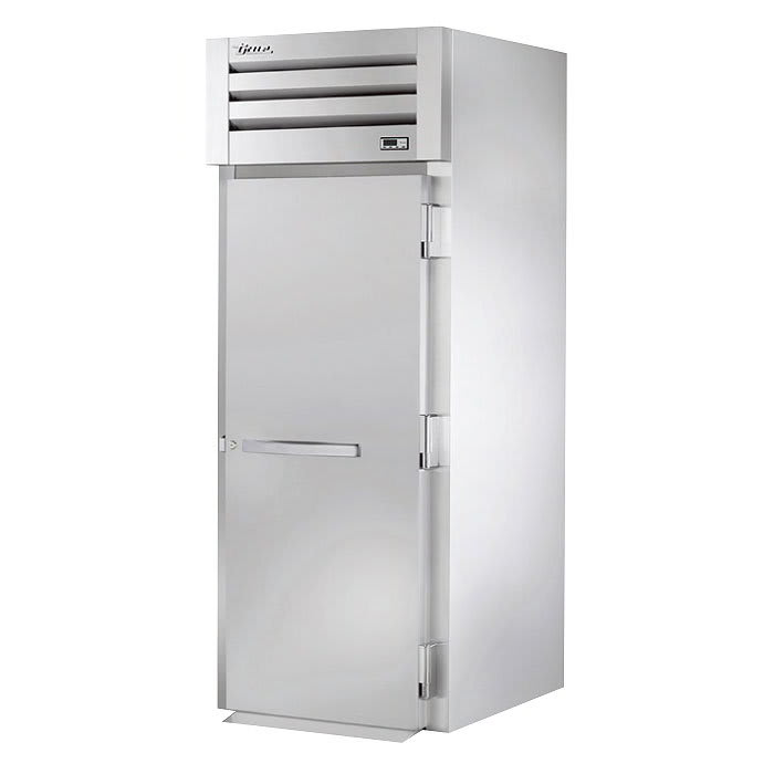 Keeping cooked food at warm, safe temperatures, the True STR1HRI89-1S Spec Series roll-in heated cabinet has a stainless steel heating element. Heat generated from this element is evenly moved throughout the interior by low-velocity fans. The temperature can be set to operate between 140 and 180 degrees Fahrenheit and is shown to staff on an external display. Humidity in the cabinet can be manually controlled with a vent on top of the unit, and a 12-inch by 20-inch water pan is included if additional steam is needed.