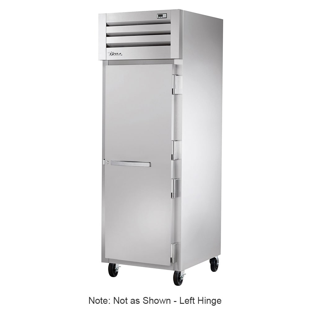 The True STR1R-1S-HC Spec Series reach-in refrigerator has a strong stainless steel construction and a door handle that withstands heavy use. Since the door has hinges on the left side, it opens from the right. When pulled slightly open, the door closes on its own, but if it is opened past 120 degrees, it stays open for loading and unloading. Product sits on three chrome-plated wire shelves, and air flows between the wires so products cool evenly. Interior LED lights ensure the products are visible, and a bolt lock keeps them secure.