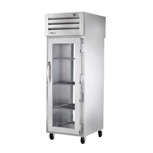 The True STR1RPT-1G-1G-HC Spec Series® pass-thru refrigerator is constructed of stainless steel, which provides rust and scratch protection. For insulation, polyurethane is foamed in the walls, and magnetic gaskets line the doors. Each door includes a bolt-style lock and is made of thermal-insulated, double-pane glass, which provides visibility and retains cold air. LED lights illuminate chilled product, while wire shelves promote airflow.