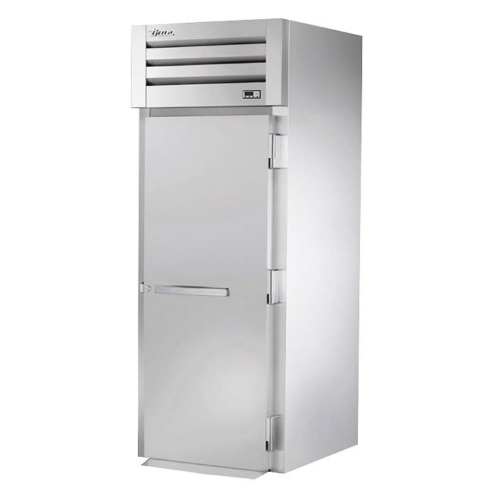 Temperatures in the True STR1RRI-1S single-section roll-in refrigerator can be set on a level between 33 and 38 degrees Fahrenheit, which operators can keep track of on the exterior display. Cold air in the unit is moved around by large fan blades, ensuring the unit cools down quickly. Mounted on the top of the unit, the refrigeration system maximizes capacity with an evaporator out of the food zone.