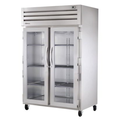 The True STR2H-2G Spec Series® full-height heated cabinet includes six chrome shelves that can be adjusted to accommodate different types of food, and 120-degre, stay-open doors provide product access. Glass panels in these doors provide visibility, enabling users to find what they are looking for before they open a door and let heat out. Durable stainless steel makes up the interior and exterior for simplified cleaning.