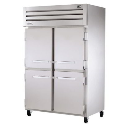 This True STR2H-4HS insulated heated cabinet keeps cooked or baked product warm until it is served. Food in the cabinet is heated by a stainless steel element, and low-velocity fans evenly move this heat around the cabinet. Temperatures can be set on a level between 140 and 180 degrees Fahrenheit on the electronic control while users can keep an eye on the temperature with the external display. Mounted on the top of the cabinet, the vent expels steam to adjust the humidity level, and this vent can be manually controlled to suit different applications.