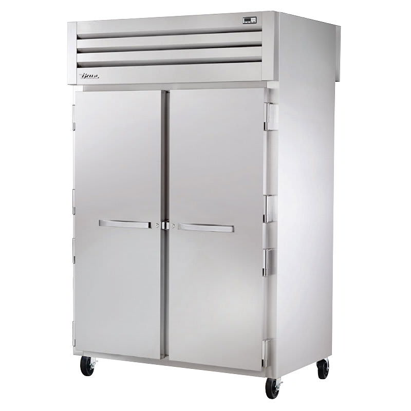 The True STR2HPT-2S-2S Spec Series® pass-thru heated cabinet keeps pre-cooked food warm at safe temperatures until it is served. It holds product between 140 and 180 degrees, as temperatures can be set to the level that fits their application on the electronic controller. Heat in the unit is generated by the element, and its stainless steel construction provides strength and rust resistance. Low-velocity fans evenly circulate heat throughout the cabinet to ensure consistent temperatures, and humidity in the cabinet is regulated by a vent that releases steam out the top of the cabinet. Operators can manually control the vent to reach a humidity level that suits specific applications.