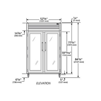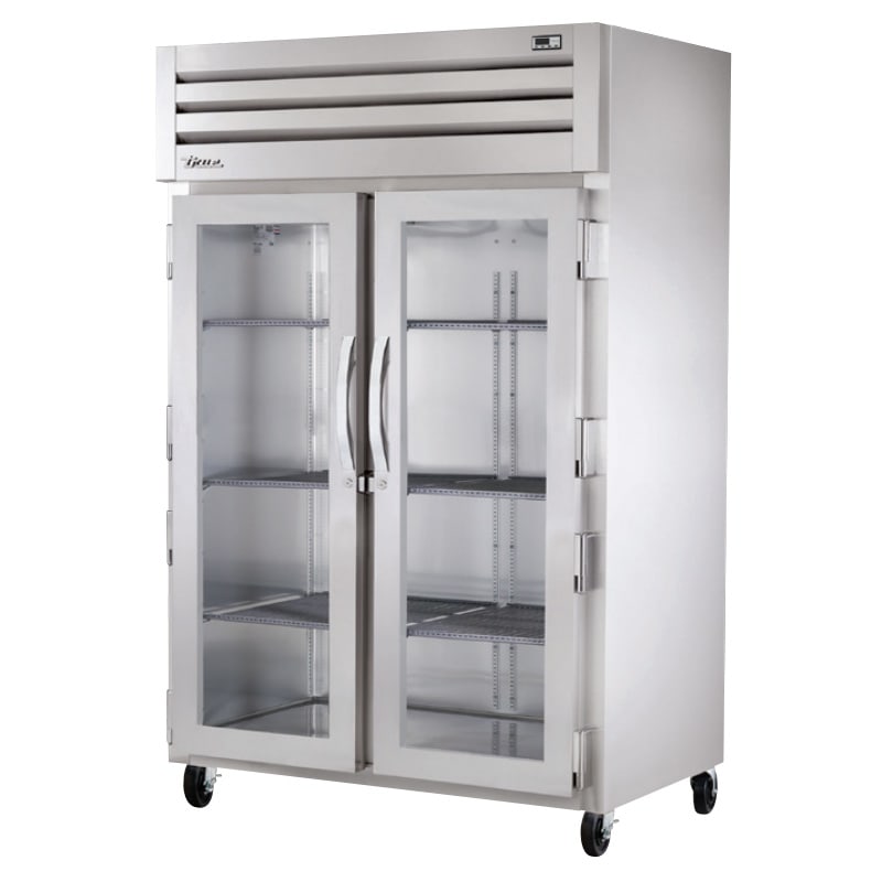 Thermal, double-pane glass doors and LED interior lights allow for full visibility of products without opening the door. These doors are self-closing but have a stay-open feature at 120 degrees. Cold air leaks are prevented with the magnetic door gaskets that easily remove for cleaning. High-density, foamed-in-place polyurethane insulation also help retain the cabinet’s cold air. The exterior and interior of this unit are made from stainless steel for durability and corrosion resistance. The True STR2R-2G reach-in refrigerator has 5-inch-diameter castors that allow you to easily move the unit for cleaning.