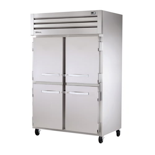 To provide mobility, the True STR2R-4HS-HC two-section refrigerator is positioned on 5-inch castors. The condenser is mounted on the top away from dust and debris from the floor and is self-contained to streamline installation. An environmentally friendly unit, it cools with natural R290 hydrocarbon refrigerant, while digital controls enable adjustment of the temperature from 33 to 38 degrees Fahrenheit. To help employees locate product, the cabinet has bright LED lights.