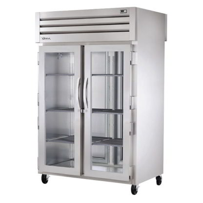 The True STR2RPT-2G-2S-HC pass-thru refrigerator has solid doors on the front and glass doors on the rear, with each door sporting locks to reduce the risk of tampering and theft at the end of a shift. To keep dust and debris from the floor out of the condenser, it’s mounted at the top and is self-contained to facilitate installation. Using R290 hydrocarbon refrigerant, this unit retains temperatures from 33 to 38 degrees Fahrenheit, which can be adjusted with digital controls.