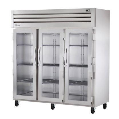 The True STR3R-3G Spec Series® three-section reach-in refrigerator’s electronic controller enables users to set the temperature between 33 and 38 degrees Fahrenheit and view this setting digitally in Fahrenheit or Celsius on the external temperature display. Mounted in the top of the unit, the refrigeration system does not operate around floor dust and dirt, though it is around grease that moves in the air.