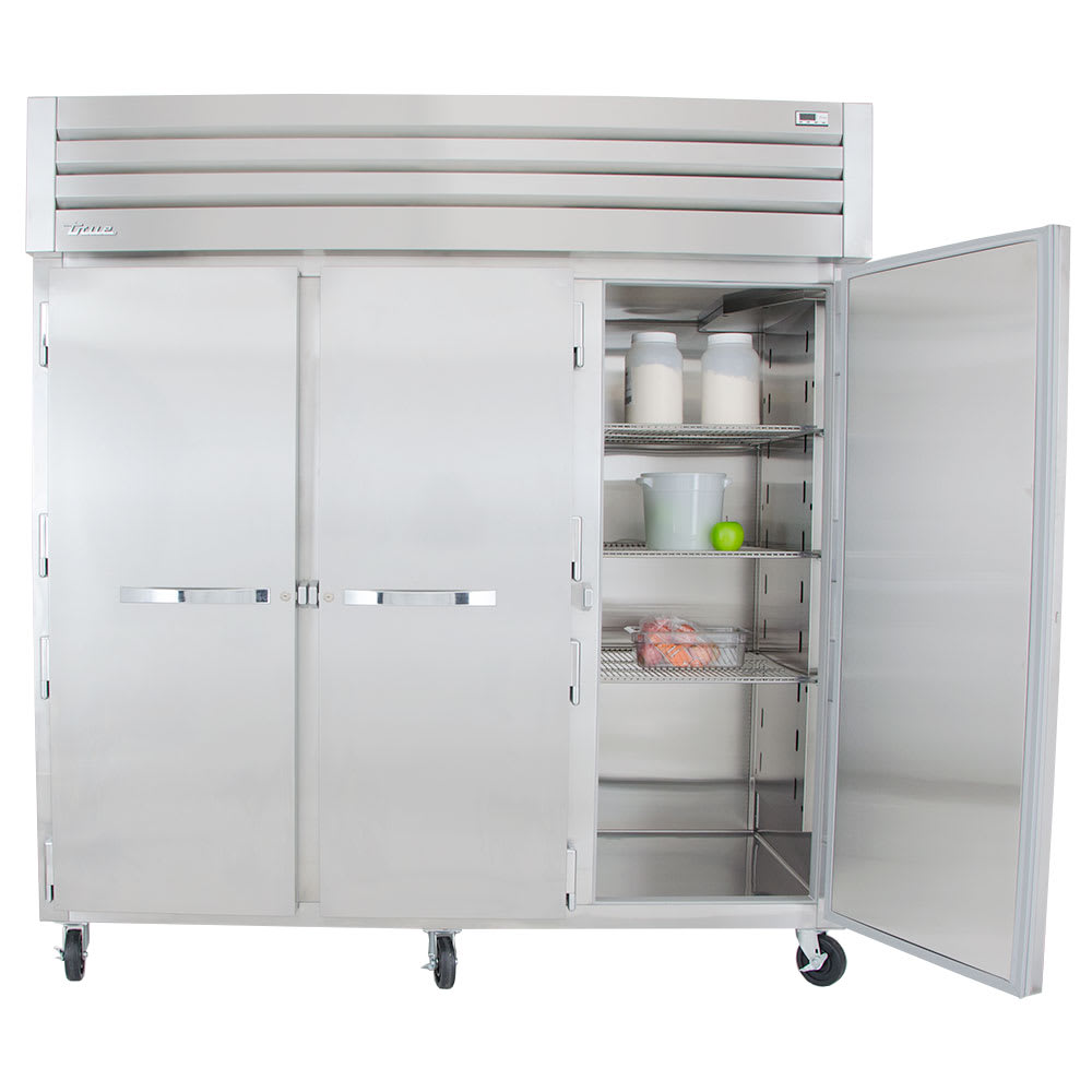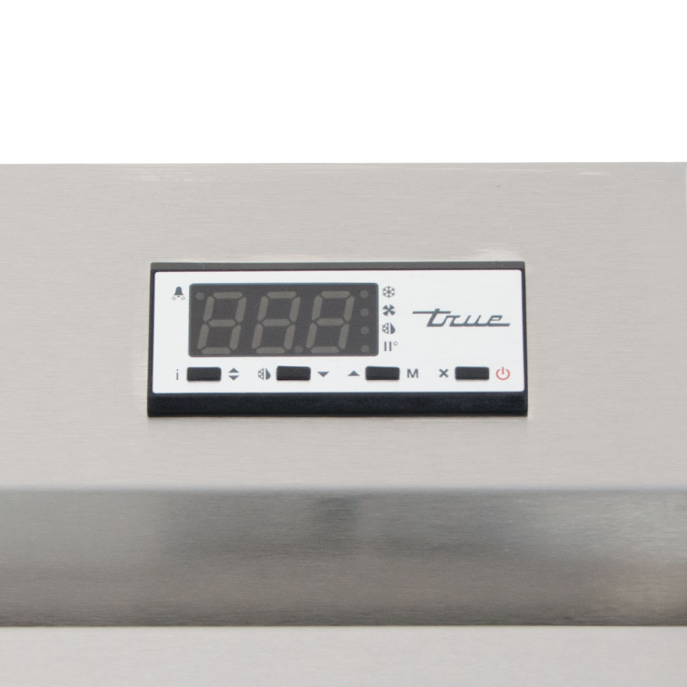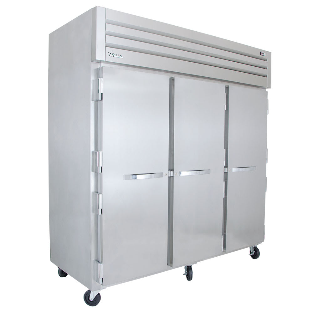 The True STR3R-3S Spec Series® reach-in refrigerator is 773⁄4 inches wide with three refrigerated sections, and its refrigeration system is mounted on top, so it is out of reach to prevent theft and tampering. Using the digital display, employees can adjust the set temperature from 33 to 38 degrees Fahrenheit. Cool air is created as R134A refrigerant moves through capillary tubes, while fans circulate the air around the sections, encouraging consistent cooling.