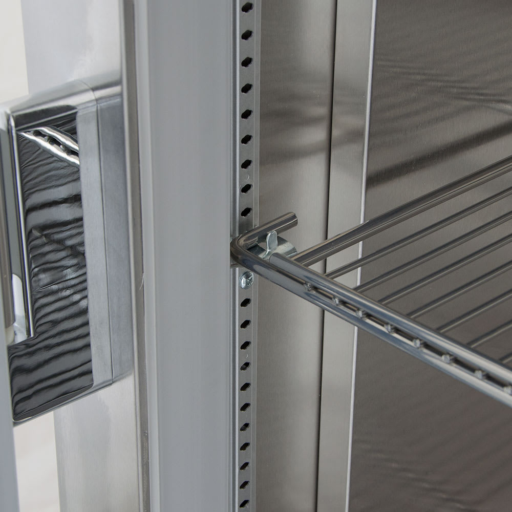 For structure and cold-air retention, high-density polyurethane insulation fills the entire cabinet and solid doors. This True STR3R-3S three-section refrigerator comes with nine chrome shelves that are 265⁄16 inches wide and 219⁄16 inches deep, and to accommodate various products, these shelves are adjustable in 1⁄2-inch increments. LED lighting brightens the interior, ensuring products are quick to find, and bolt locks protect contents from unauthorized individuals.