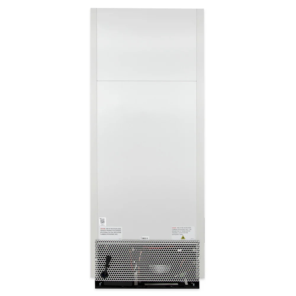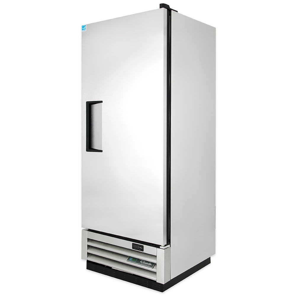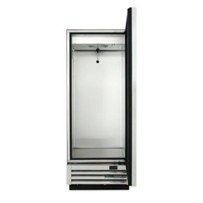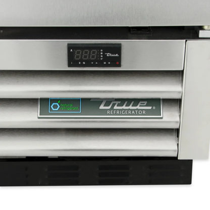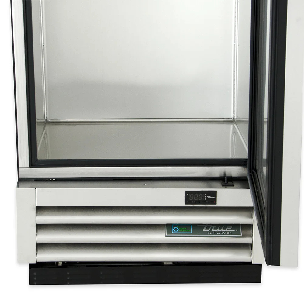 The True T-12-HC reach-in refrigerator uses a capillary tube system to ensure temperatures are cool. A temperature range of 33 to 38 degrees Fahrenheit is maintained by R290 hydrocarbon refrigerant, and the electronically commutated condenser and evaporator fan motors move a consistent volume of air. The refrigeration system is mounted on the bottom, which is in the coolest area of the kitchen.