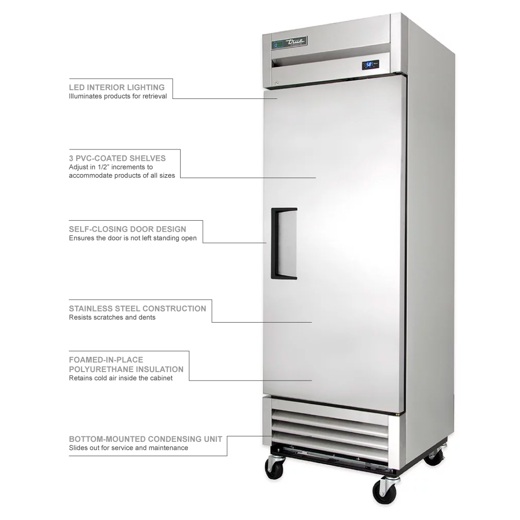 The door and front are made of stainless steel to withstand repeated, heavy use. Its black powder-coated frame is strong and provides structure. For mobility, castors are mounted on the True T-19-HC reach-in refrigerator frame rail. It has an aluminum interior liner and stainless steel floor that resist corrosion and are easy to clean. Products sit on three adjustable, PVC-coated shelves, and LED lights shine on them for visibility. Cold air is retained in the cabinet since it is insulated with foamed-in-place polyurethane.
