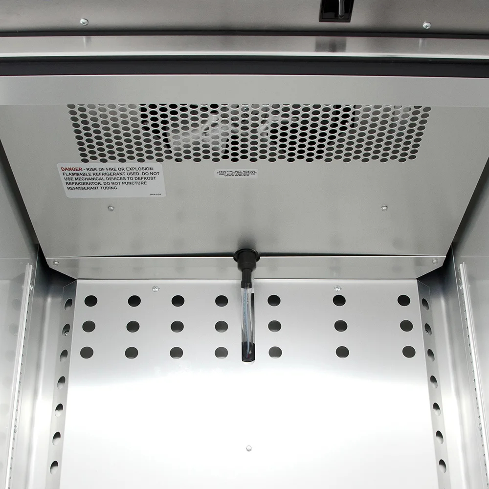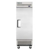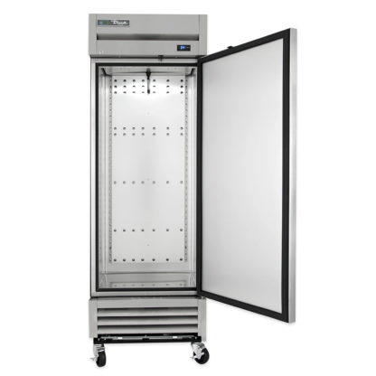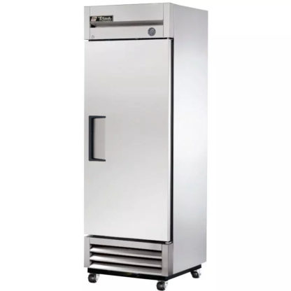 The three shelves in the True T-19F-HC one-section reach-in freezer are PVC coated to resist corrosion and are made of wire so air can flow freely around stored items. Operators can adjust the shelves to best accommodate whatever products they are storing. LED lighting enhances visibility in the cabinet, so users can quickly find what they are looking for. Its interior has an aluminum liner that prevents rust, and its stainless steel floor can be cleaned with a swipe since it has crevice-free coved corners.
