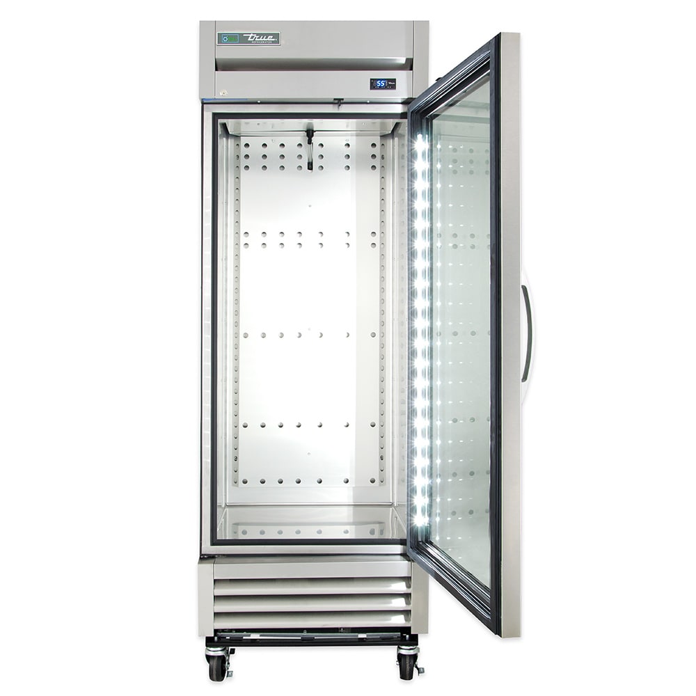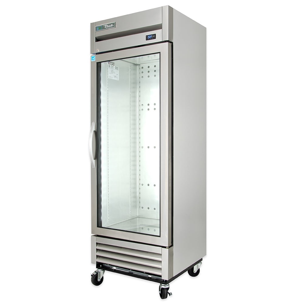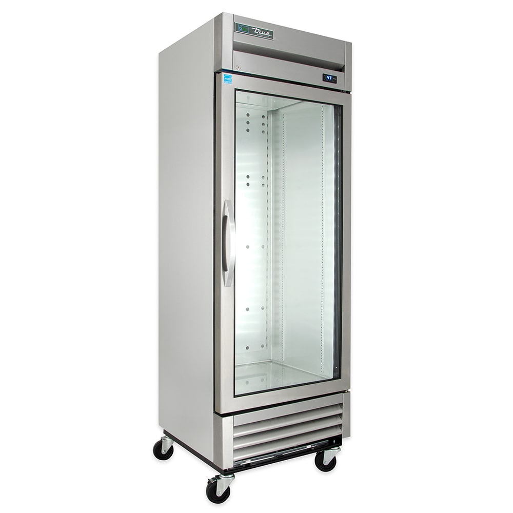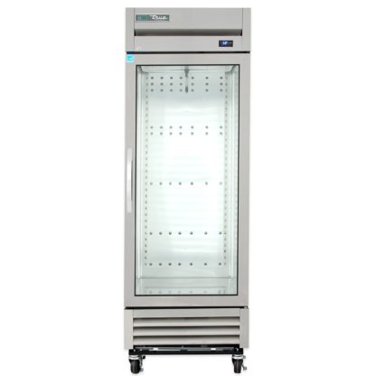 Built with a stainless steel front and an aluminum back, top, and sides, the cabinet of the True T-19G-HC~FGD01 glass door refrigerator withstands heavy use. The interior of the cabinet has a clear-coat aluminum liner for cleanup and corrosion resistance, and its floor is made of stainless steel with coved corners. Three gray, PVC-coated wire shelves are included and are adjustable in 1/2-inch increments for a customized storage solution. Product is visible through the double-pane, thermal glass door.