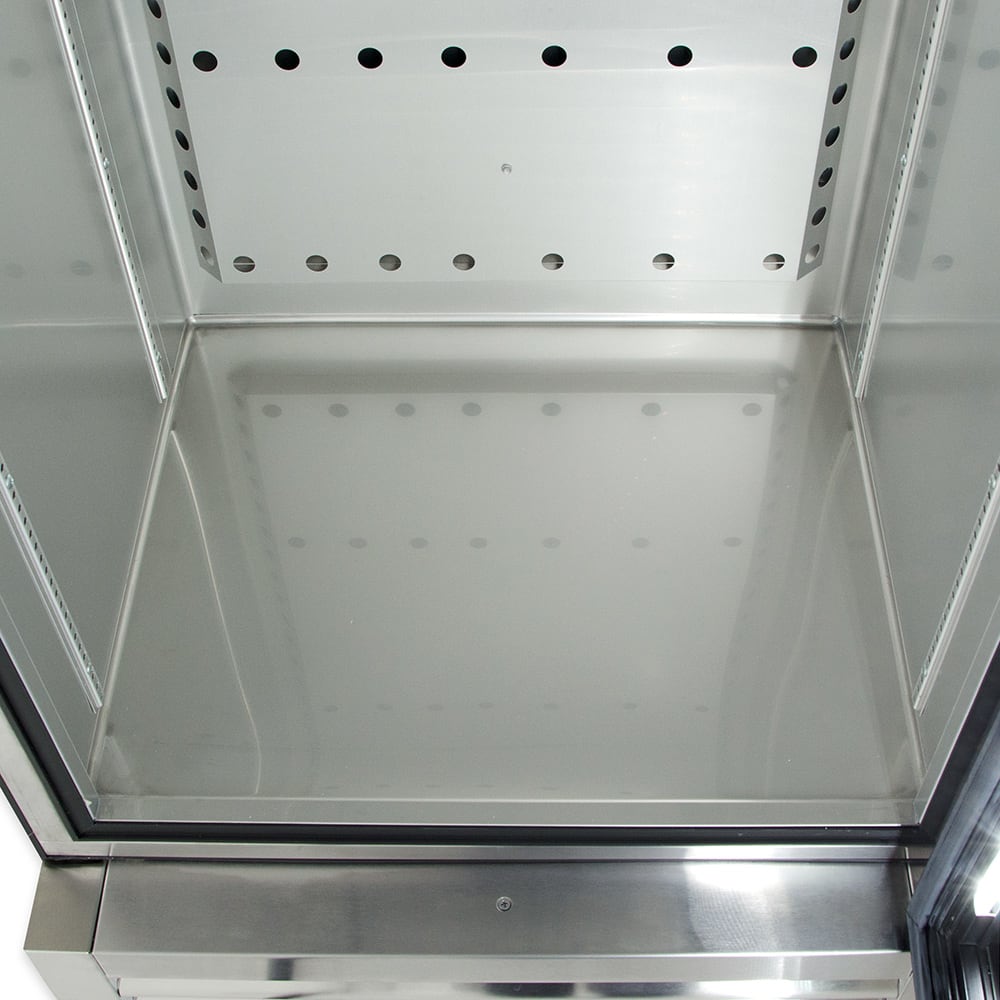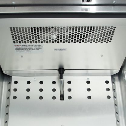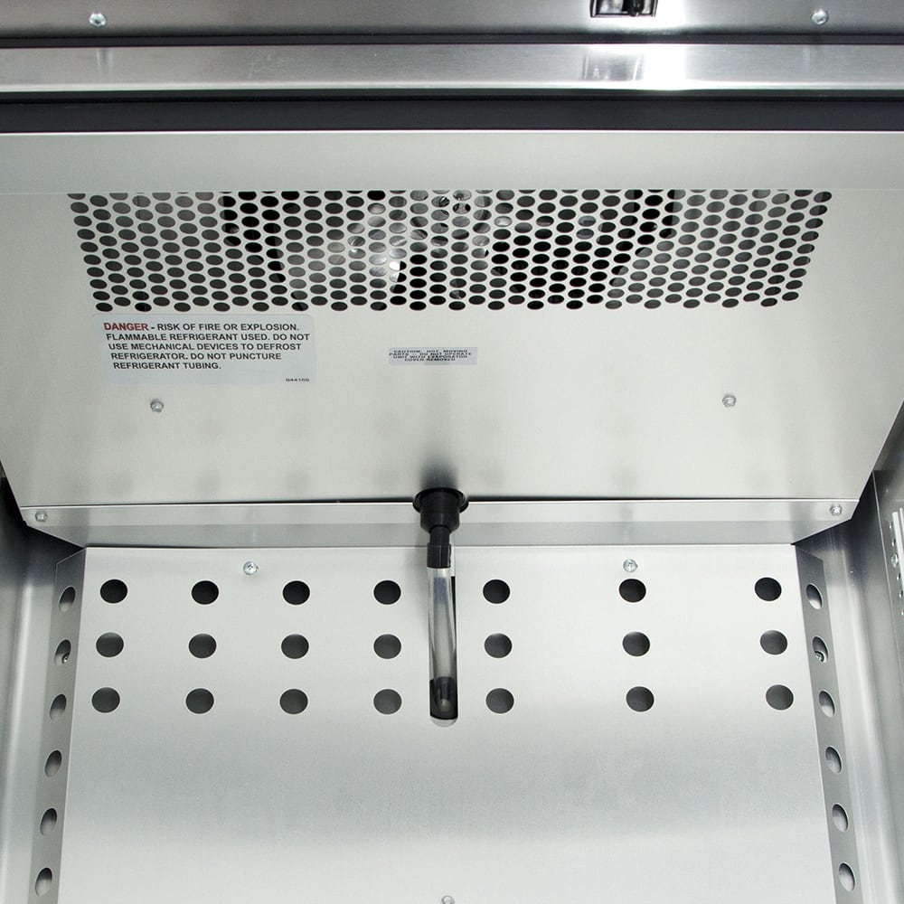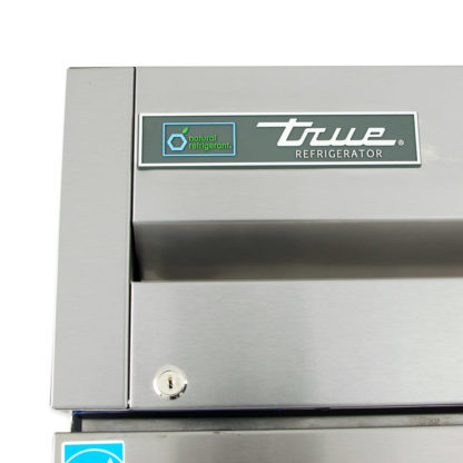 The True T-19G-HC~FGD01 reach-in refrigerator uses R290 hydrocarbon refrigerant in its capillary tube system to maintain a temperature range of 33 to 38 degrees Fahrenheit. The system uses condenser and evaporator fans to circulate a high volume of low-velocity air throughout the cabinet to keep temperatures even. Since the condensing unit is mounted on the bottom, it is easy to reach for maintenance. However, the condenser can become since it is so close to the floor.