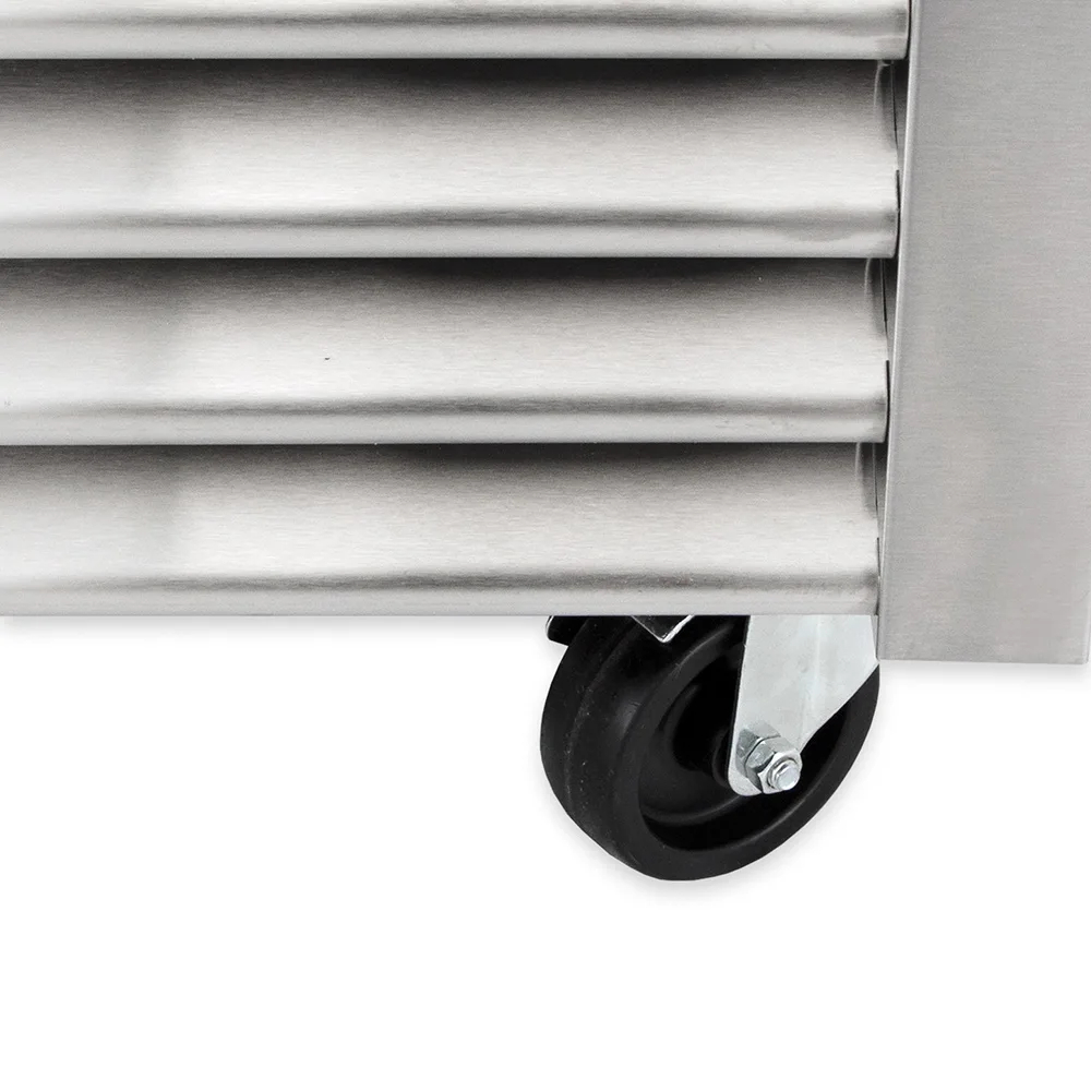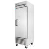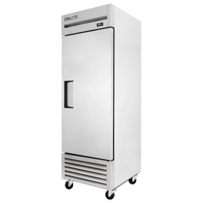 This reach-in freezer is built with a sturdy cabinet constructed of a stainless steel front and an anodized aluminum back, top, and sides. Its aluminum interior has a clear coat to simplify cleanup while a stainless steel floor with coved corners enables users to wipe up spills and debris. The True T-23F-HC freezer has a right-hinged door that opens on the left. To create a positive seal and prevent air leaks, the unit has a magnetic gasket, while the solid door is self-closing.