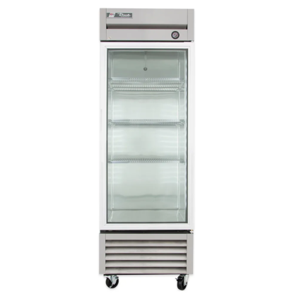 Refrigerator, reach-in, one-section, framed glass door version 01, (1) glass door, (3) PVC coated adjustable wire shelves, LED interior lighting, stainless steel front, aluminum sides, clear coated aluminum interior with stainless steel floor, 4″ castors, R290 Hydrocarbon refrigerant, 1/4 HP, 115v/60/1-ph, 2.2 amps, NEMA 5-15P, cULus, UL EPH Classified, Made in USA