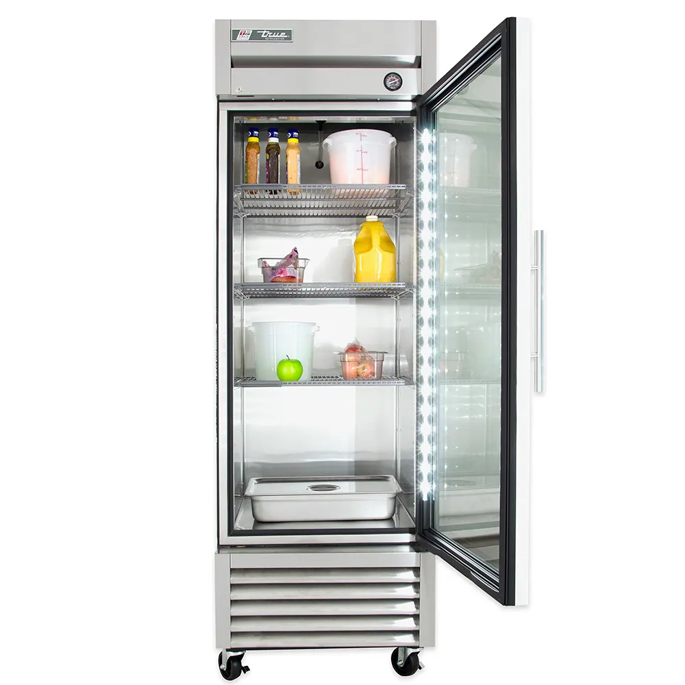 The double-pane glass door on the True T-23G-HC~FGD01 single-section refrigerator helps staff members find ingredients without opening the door and releasing cold air. With a torsion closure system, this door closes by itself, and magnetic gaskets create a seal to reduce cold air leaks around the door frame. LED lights shine on the interior’s PVC-coated shelves, which adjust in 1/2-inch increments.