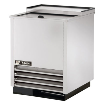 This True T-24-GC-S-HC one-section glass chiller has a stainless steel exterior and galvanized steel interior to resist corrosion and dents. Inside, three PVC-coated wire shelves support mugs, holding (85) 10-ounce steins or (90) 8-inch mugs. To consistently distribute air, this True T-24-GC-S-HC glass chiller has electronically commutated condenser and evaporator fan motors, which also reduce energy consumption and heat production. Its self-contained capillary tube system controls the flow of R290 hydrocarbon refrigerant. To simplify maintenance, the condensing unit slides out and maintains 0 degrees Fahrenheit, while an automatic defrost cycle runs at a set time and stops when a certain temperature is reached.