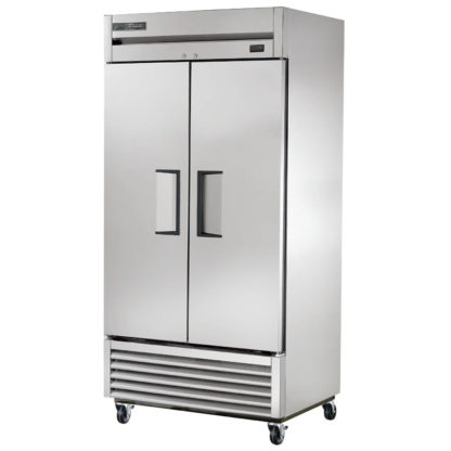 The True T-35F-HC reach-in freezer maintains an average temperature of -10 degrees Fahrenheit, which is visible on the external digital display. Condenser and evaporator fan motors create a consistent air volume, and the evaporator is coated in epoxy to resist corrosion. Accessing the refrigeration system is convenient since it is mounted on the bottom of the cabinet, while an automatic defrost feature starts based on time and stops when the unit reaches a certain temperature.