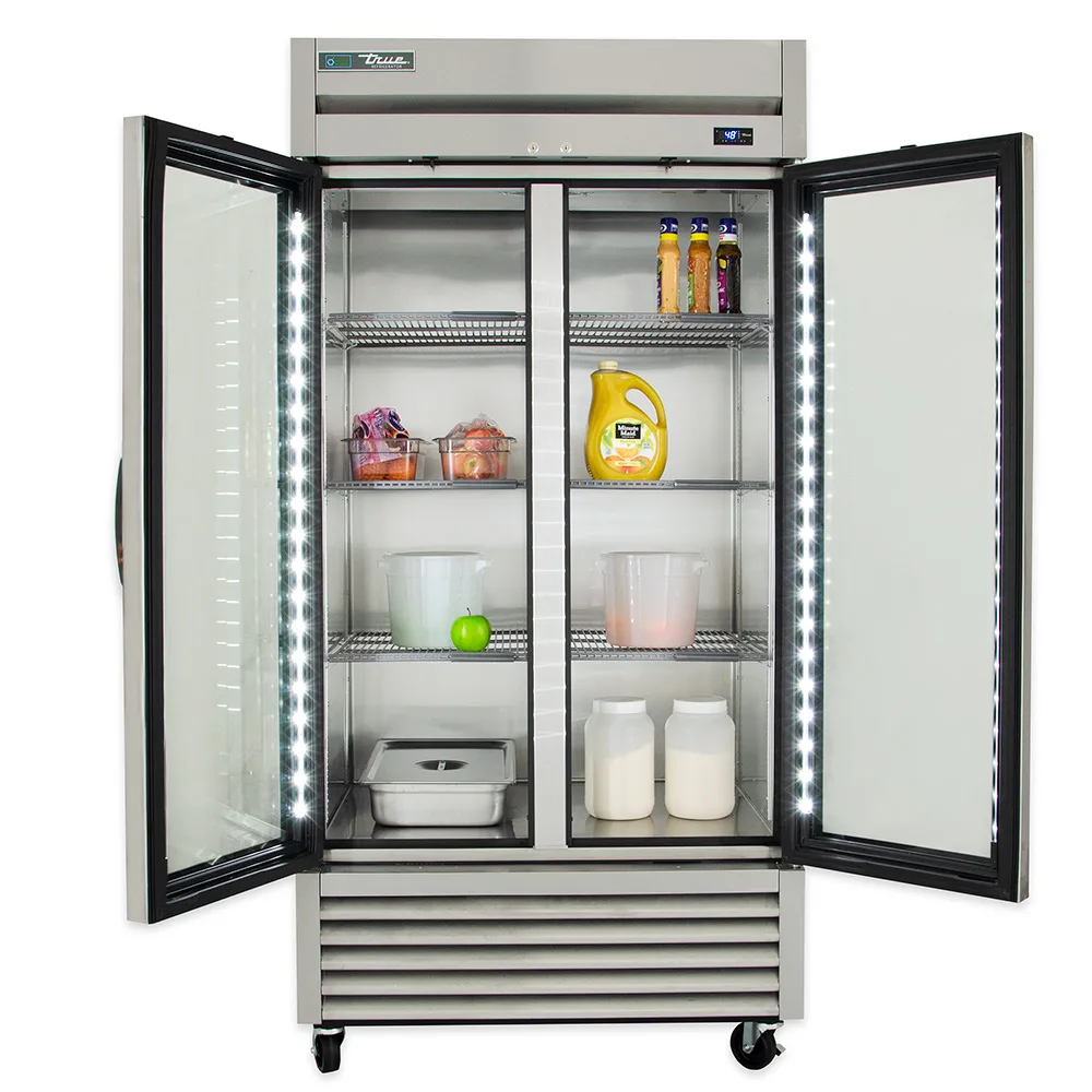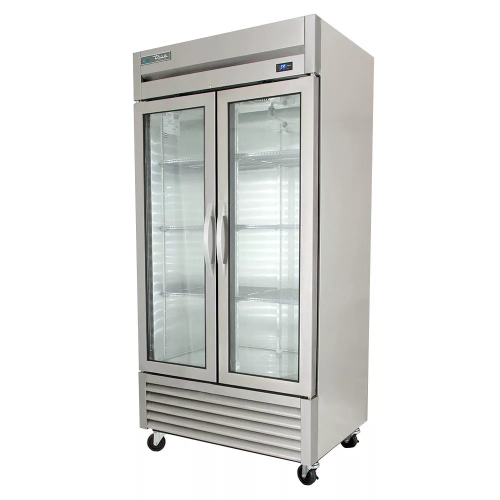 Using eco-friendly R290 hydrocarbon refrigerant and a self-contained capillary tube system, the True T-35G-HC~FGD01 one-section refrigerator maintains temperatures at 33 to 38 degrees Fahrenheit. It features a stainless steel front and a clear-coated interior to ensure strength and corrosion resistance in high-volume operations. Being a two-section unit, its interior can be accessed through two self-closing, double-paned, thermal glass doors.