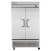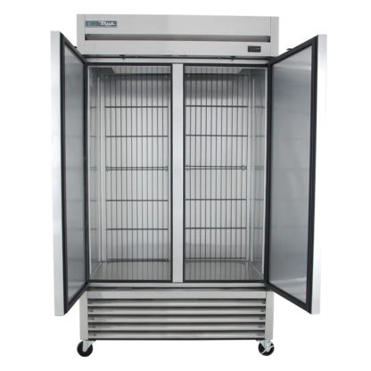 The True T-43F-HC reach-in freezer uses its large condenser and evaporator coils combined with a high-horsepower compressor to maintain an average internal temperature of -10 degrees Fahrenheit. That temperature is ideal for storing ice cream and frozen food product, as large fan blades force a high volume of air slowly through the cabinet to create even temperatures. Guards in the back of the cabinet ensure products do not interfere with optimal airflow.