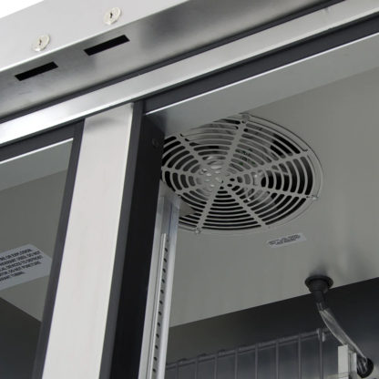 - Sealed, cast iron motors power large evaporator fans to push high volumes of low-velocity air through the cabinet for even temperatures throughout