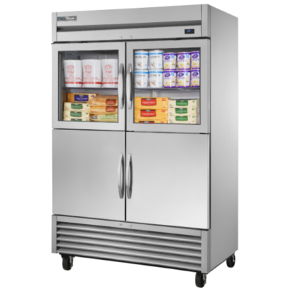 This refrigerator has four doors. Its glass half doors are made of double-pane glass, and the solid half doors are constructed of stainless steel and lined with aluminum. Solid doors have 12-inch recessed handles that do not stick into the aisles, and the glass doors have 15-inch extruded handles for a comfortable grip. All doors close on their own and have locks to prevent theft, while magnetic gaskets snap into the door frames to prevent cold air from seeping out.