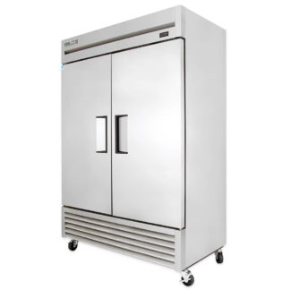 The True T-49-4-HC reach-in refrigerator ensures cold air is evenly distributed with condenser and evaporatofT-49-4-HCr fan motors, while the self-contained capillary tube system uses R290 hydrocarbon refrigerant to maintain cool temperatures. Temperatures in the cabinet can be set between 33 and 38 degrees Fahrenheit, and since the refrigeration system is mounted on the bottom of the unit, it is accessible for maintenance