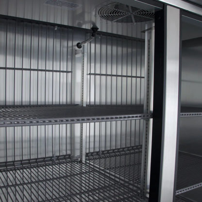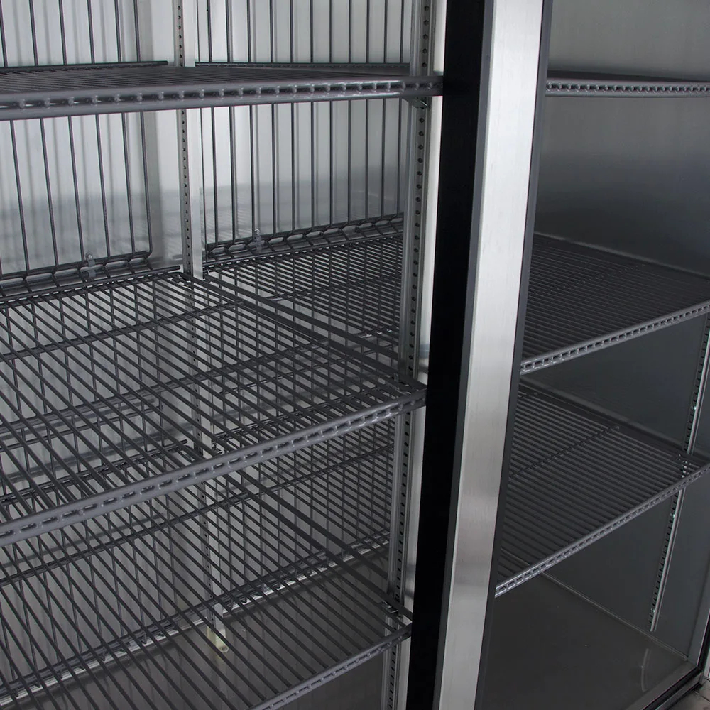 The cabinet is insulated with polyurethane foam for cold air retention, and the True T-49FG-HC~FGD01 two-section freezer has six PVC-coated wire shelves that can be adjusted in 1⁄2-inch increments. Its doors are made of triple-pane glass and close on their own to conserve cold air. Magnetic gaskets snap into the door frame to prevent cold air leaks while the interior is brightened with LED lights. Movement is provided with 4-inch stem castors, which have locks on the front set for stability.