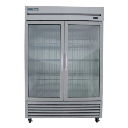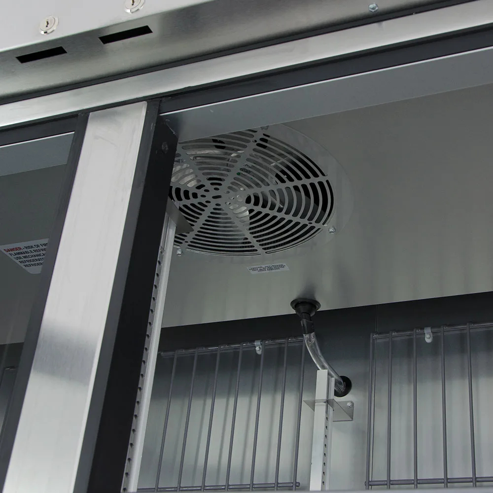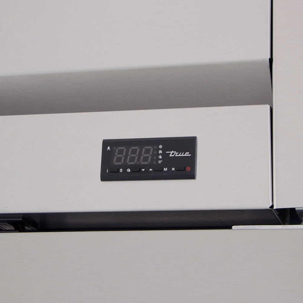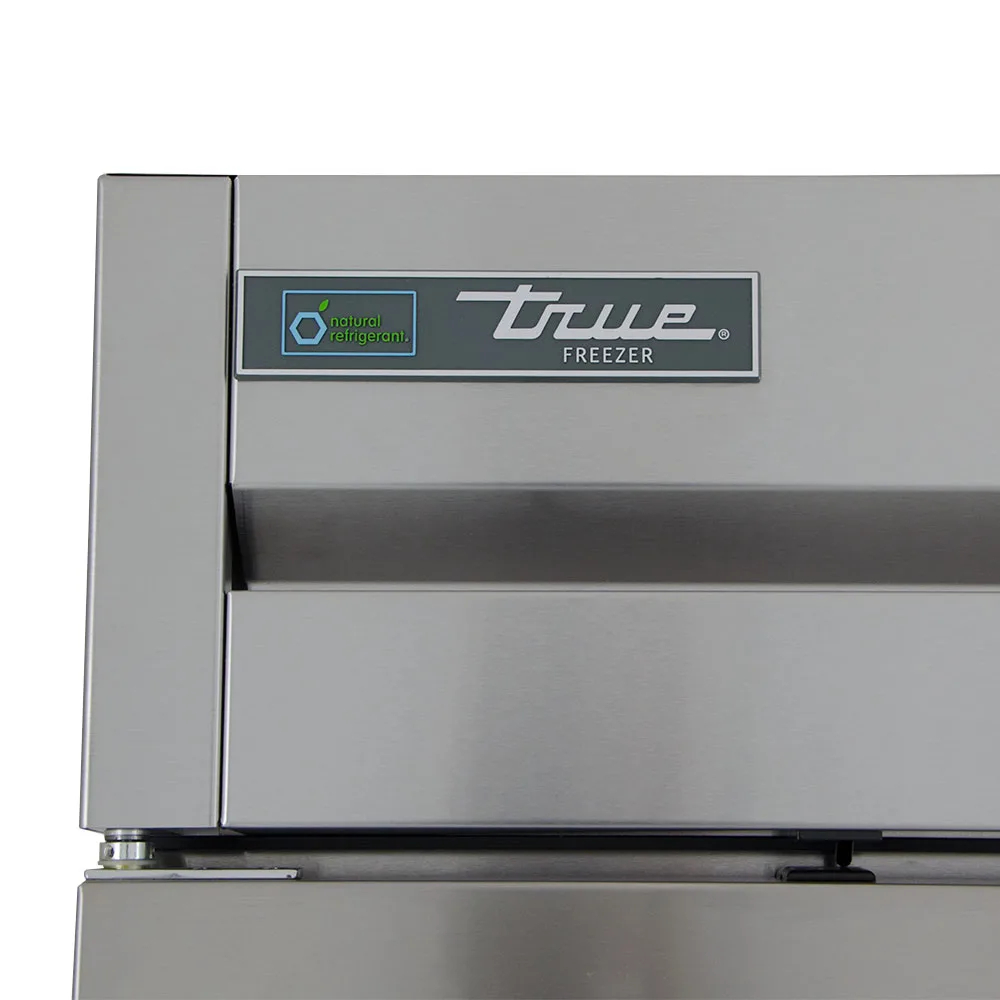 The True T-49FG-HC~FGD01 glass door freezer maintains a steady temperature of -10 degrees Fahrenheit, an ideal temperature for frozen food, and the capillary tube system controls the flow of R290 hydrocarbon refrigerant. Evaporator and condenser fan motors provide quick temperature recovery and ensure all product is chilled evenly. Its refrigeration system is mounted on the bottom of the cabinet, so it is accessible for maintenance.