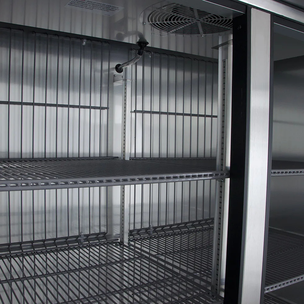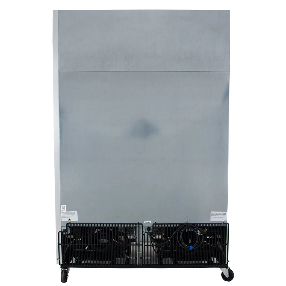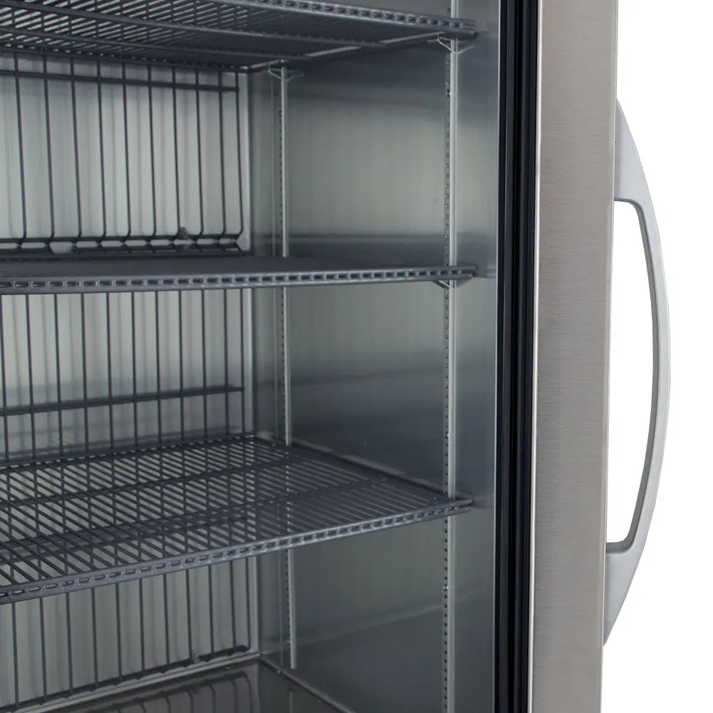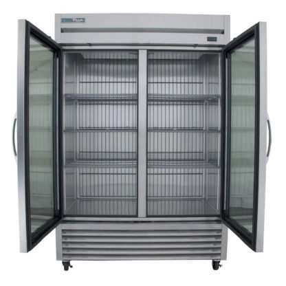 The True T-49FG-HC~FGD01 glass door freezer maintains a steady temperature of -10 degrees Fahrenheit, an ideal temperature for frozen food, and the capillary tube system controls the flow of R290 hydrocarbon refrigerant. Evaporator and condenser fan motors provide quick temperature recovery and ensure all product is chilled evenly. Its refrigeration system is mounted on the bottom of the cabinet, so it is accessible for maintenance.
