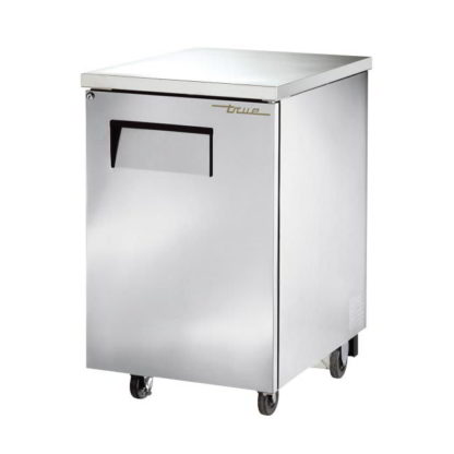 Foamed-in-place polyurethane insulation seals cold air inside the cabinet, which can accommodate as many as 30 six-packs of 12-ounce cans or one half-barrel keg. To store different sizes of product, two PVC-coated wire shelves can be adjusted in 1⁄2-inch increments. For rust and dent resistance, the True TBB-1-S-HC one-section bar refrigerator has a stainless steel front and sides with a stainless steel countertop for preparing drinks. The aluminum exterior back provides corrosion resistance, and the stainless steel interior walls have a 1⁄2-inch reinforced lip to keep spills in the unit.