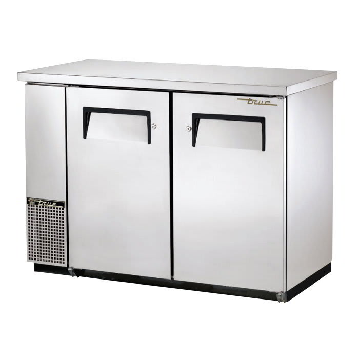 The True TBB-24-48-S-HC two-section bar refrigerator can hold 48 six-packs of 12-ounce cans or two half-barrel kegs. Improving visibility, LED lighting shines on products that are stored on four adjustable, PVC-coated shelves. Its stainless steel interior floor is quick to clean when drinks spill. With a stainless steel and aluminum exterior, this refrigerator is sturdy and durable. Two solid, heavy-duty doors swing open and are fitted with locks to prevent access.