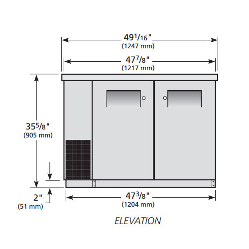 Back Bar Cooler, two-section, 49-1/8″W, (48) 6-packs or (2) 1/2 keg capacity, (4) wire shelves, condensing unit on left, (2) full doors with locks, LED interior lights, stainless steel top, galvanized interior with stainless steel floor, black powder coated cold-rolled steel exterior, R290 Hydrocarbon refrigerant, 1/5 HP, 115v/60/1-ph, 2.1 amps, NEMA 5-15P, cULus, UL EPH Classified, Made in USA