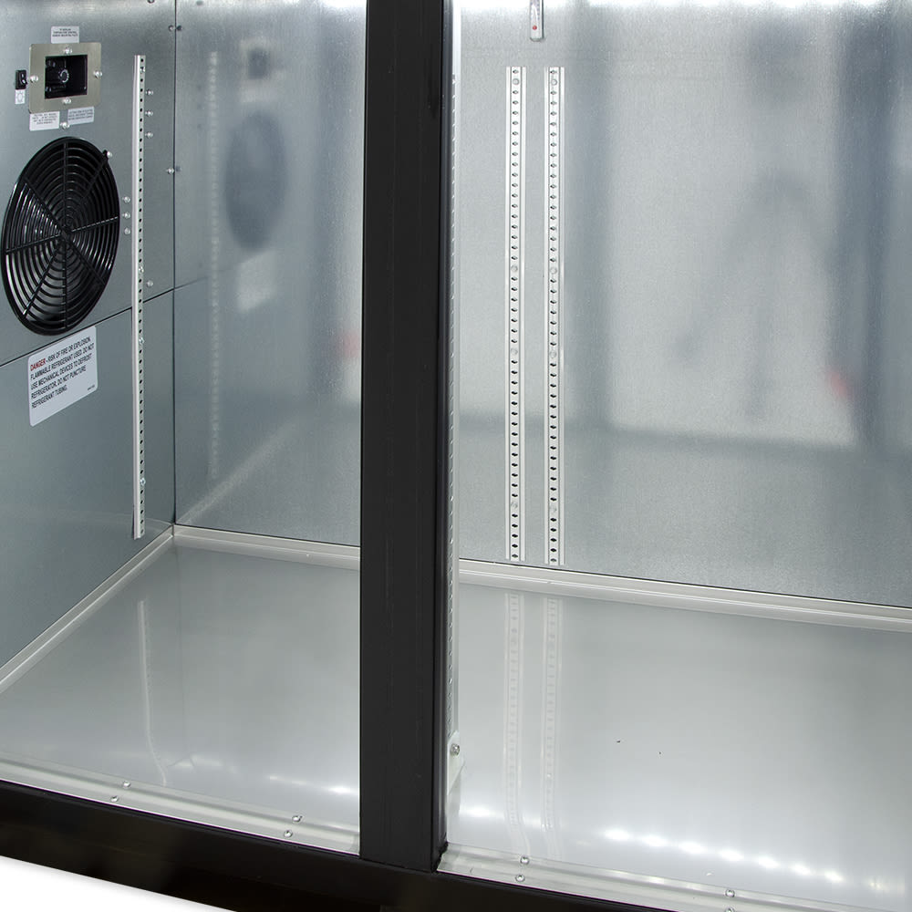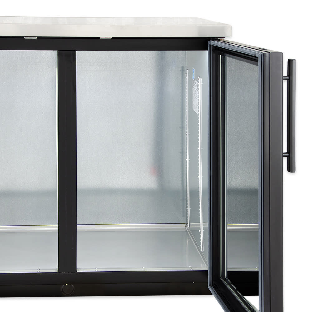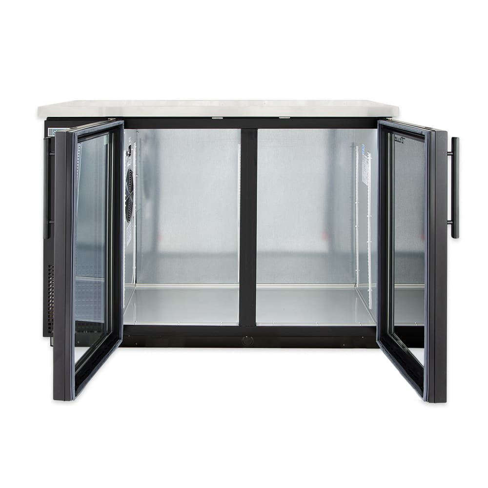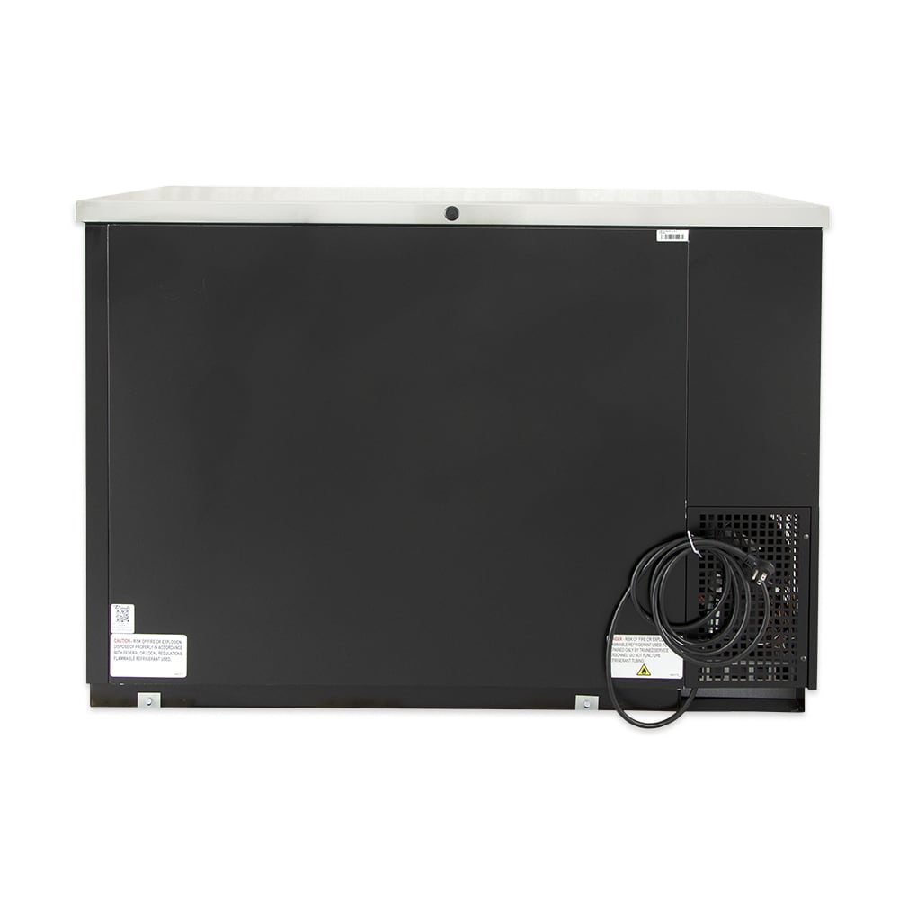 Back Bar Cooler, two-section, 49-1/8″W, (48) 6-packs or (2) 1/2 keg capacity, (4) wire shelves, condensing unit on left, (2) glass doors with locks, LED interior light, stainless steel top, galvanized interior with stainless steel floor, black powder coated cold-rolled steel exterior, R290 Hydrocarbon refrigerant, 1/5 HP, 115v/60/1-ph, 2.1 amps, NEMA 5-15P, cULus, UL EPH Classified, Made in USA, ENERGY STAR
