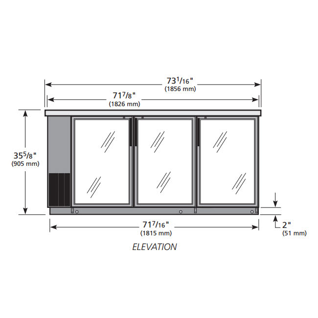 Back Bar Cooler, three-section, 73-1/8″W, (105) 6-packs or (3) 1/2 keg capacity, (6) wire shelves, condensing unit on left, stainless steel top, (3) glass doors with locks, LED interior light, galvanized interior with stainless steel floor, black powder coated cold-rolled steel exterior, R290 Hydrocarbon refrigerant, 1/4 HP, 115v/60/1-ph, 2.7 amps, NEMA 5-15P, cULus, UL EPH Classified, Made in USA