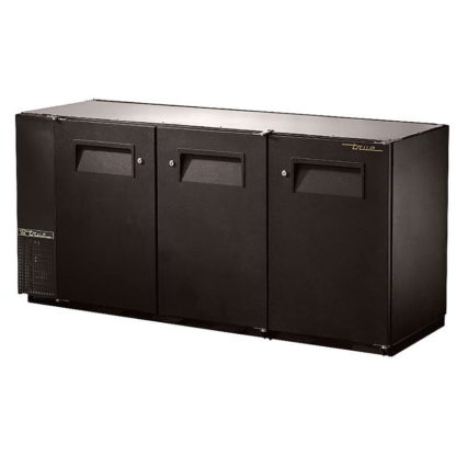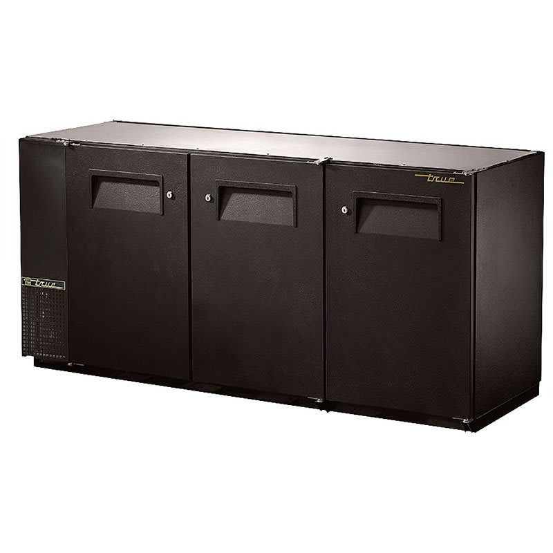 The True TBB-24GAL-72-HC three-section bar refrigerator has three black vinyl doors that are resistant to wear and tear, and each one has a 12-inch handle that is permanently attached. Cold-air leaks are prevented with magnetic door gaskets, and unwanted access to products can be prevented by the included locks. Sturdiness is provided by a black, powder-coated steel frame rail. Resistant to scratches, the black vinyl front and sides and the black aluminum back are durable. Cold air is kept in the cabinet by foamed-in-place polyurethane insulation.