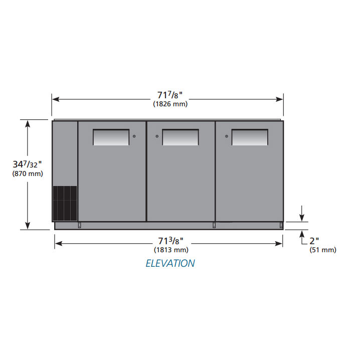 Back Bar Cooler, three-section, 24″ deep, 34-1/4″ high, (84) 6-packs or (3) 1/2 keg capacity, (6) wire shelves, condensing unit on left, galvanized sub top, galvanized interior with stainless steel floor, black vinyl exterior, (3) full doors, fluorescent interior lights, 1/5 HP, 115v/60/1, 5.2 amps, reverse condensing fan motor, 7′ cord, NEMA 5-15P, MADE IN USA
