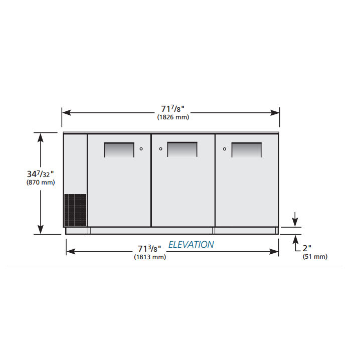 Back Bar Cooler, three-section, 71-7/8″W, (84) 6-packs or (3) 1/2 keg capacity, (4) wire shelves, condensing unit on left, galvanized sub top, (3) full doors with locks, LED interior lights, galvanized interior with stainless steel floor, stainless steel front & sides, aluminum back, R290 Hydrocarbon refrigerant, 1/4 HP, 115v/60/1-ph, 2.7 amps, NEMA 5-15P, cULus, UL EPH Classified, Made in USA