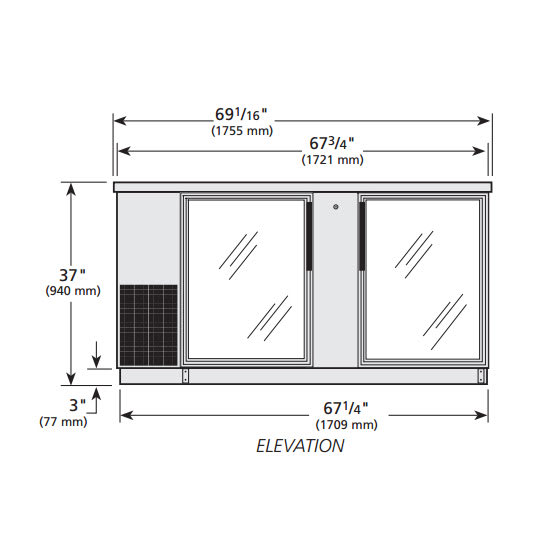 Back Bar Cooler, two-section, 69-1/8″W, (112) 6-packs or (3) 1/2 keg capacity, (4) shelves, condensing unit on left, stainless steel top, (2) glass doors with locks, LED interior light, galvanized interior with stainless steel floor, stainless steel exterior, R290 Hydrocarbon refrigerant, 1/4 HP, 115v/60/1-ph, 2.8 amps, NEMA 5-15P, cULus, UL EPH Classified, Made in USA, ENERGY STAR