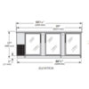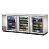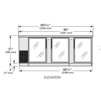 Back Bar Cooler, three-section, 90-3/8″W, (152) 6-packs or (4) 1/2 keg capacity, (6) shelves, condensing unit on left, stainless steel top, (3) glass doors with locks, LED interior light, galvanized interior with stainless steel floor, stainless steel exterior, R290 Hydrocarbon refrigerant, 1/4 HP, 115v/60/1-ph, 2.8 amps, NEMA 5-15P, cULus, UL EPH Classified, Made in USA, ENERGY STAR