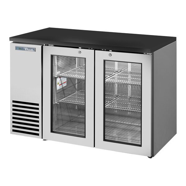 This True TBB24-48-2G-Z1-BST-S-1 back bar cooler can hold 48 six-packs of 12-ounce cans on four adjustable wire shelves. With their wire design, the shelves promote airflow around stored items, and when they are removed, the unit can accommodate two half-barrel kegs, depending on the tapping kit. LED lights help customers see product despite low lighting, and the doors lock to reduce the chance of theft. Made of stainless steel to support heavy loads, the floor and the door threshold can withstand regular use. All interior surfaces resist corroding in case of spills.