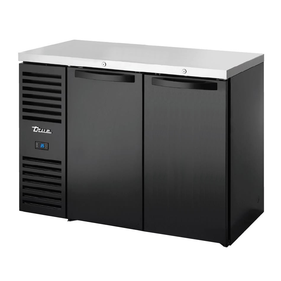 Refrigerated Back Bar Cooler, two-section, 48″W, (76) 6-pack cans or (43) 6-pack bottles capacity, side mounted self-contained refrigeration, (2) solid hinged doors (locking), (6) adjustable shelves, LED interior lighting, stainless steel countertop, black powder coated exterior, stainless steel interior (sides & floor), R290 Hydrocarbon refrigerant, 1/5 HP, 115v/60/1-ph, 1.8 amps, NEMA 5-15P, cULus, UL EPH Classified, Made in USA