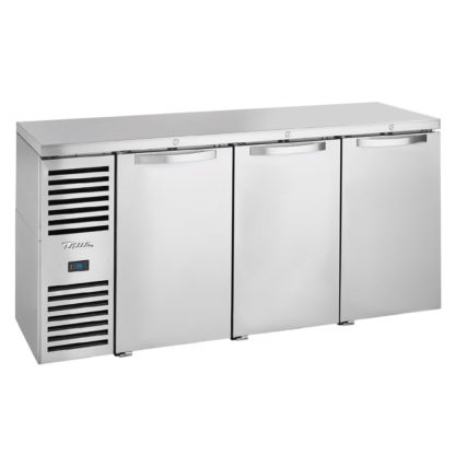 Refrigerated Back Bar Cooler, three-section, 72″W, (125) 6-pack cans or (78) 6-pack bottles capacity, side mounted self-contained refrigeration, (3) solid hinged doors (locking), (9) adjustable shelves, LED interior lighting, stainless steel countertop, stainless steel exterior, stainless steel interior (sides & floor), R290 Hydrocarbon refrigerant, 1/4 HP, 115v/60/1-ph, 3.2 amps, NEMA 5-15P, cULus, UL EPH Classified, Made in USA